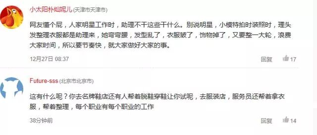 還有網友指出,這不是在拍攝工作的正常狀態嘛,讓助理幫忙穿脫更有效率,畢竟她一彎腰,頭髮亂了衣服皺了,不又得麻煩造型師整理。