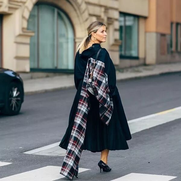 簡單大方的格紋大衣搭配長裙,露出衣領和袖子,製造出自然隨意的層疊感。