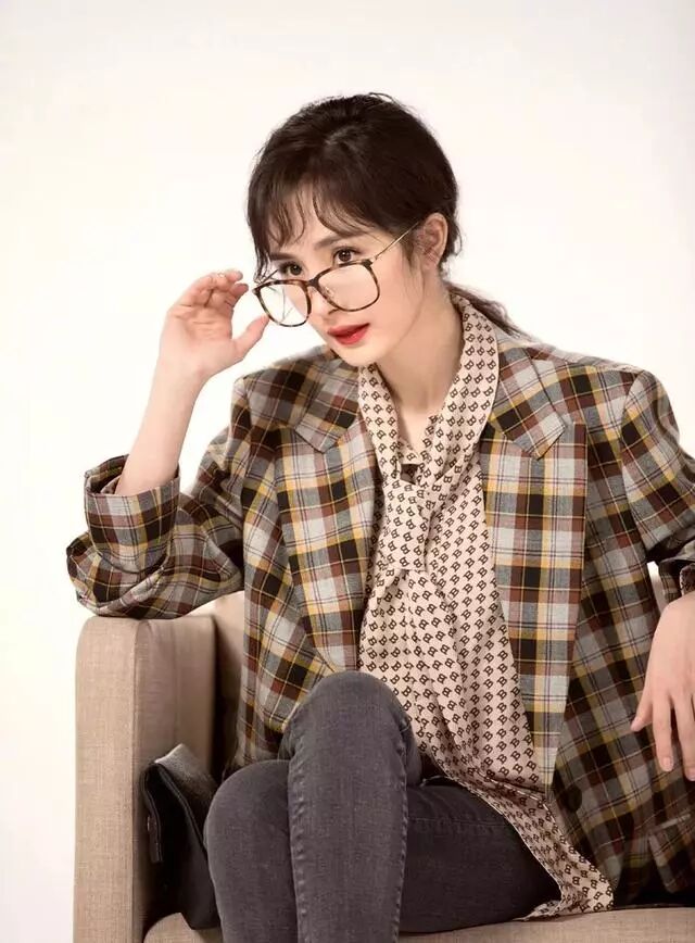 大冪冪的這件格紋外套十分帥氣,再配上同色系圖案的眼鏡,妥妥的氣質女神。