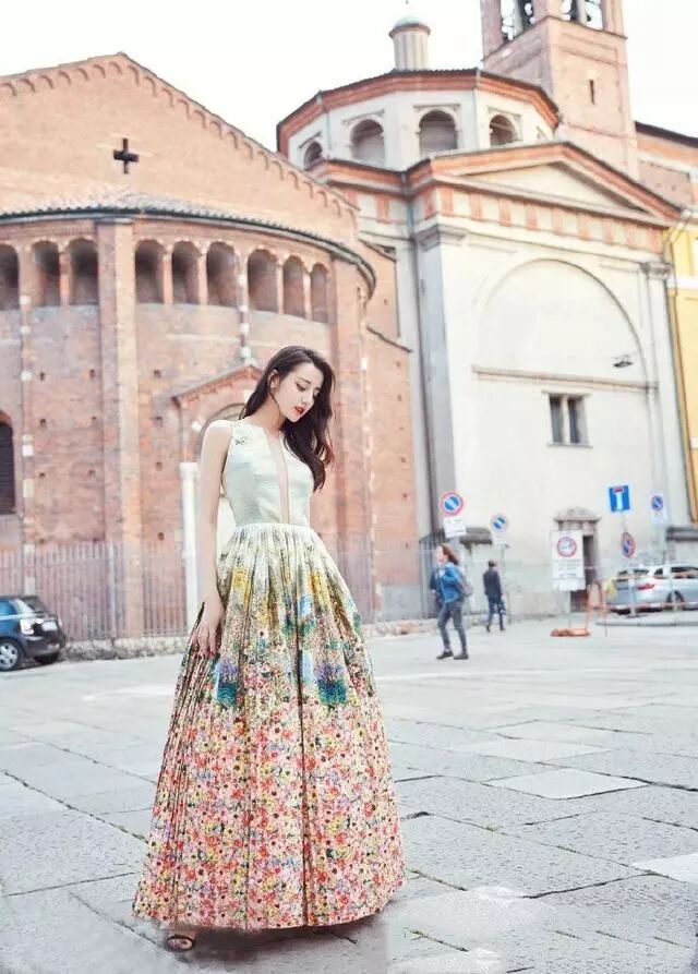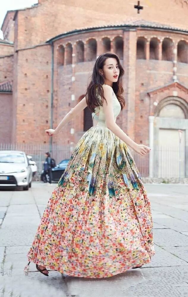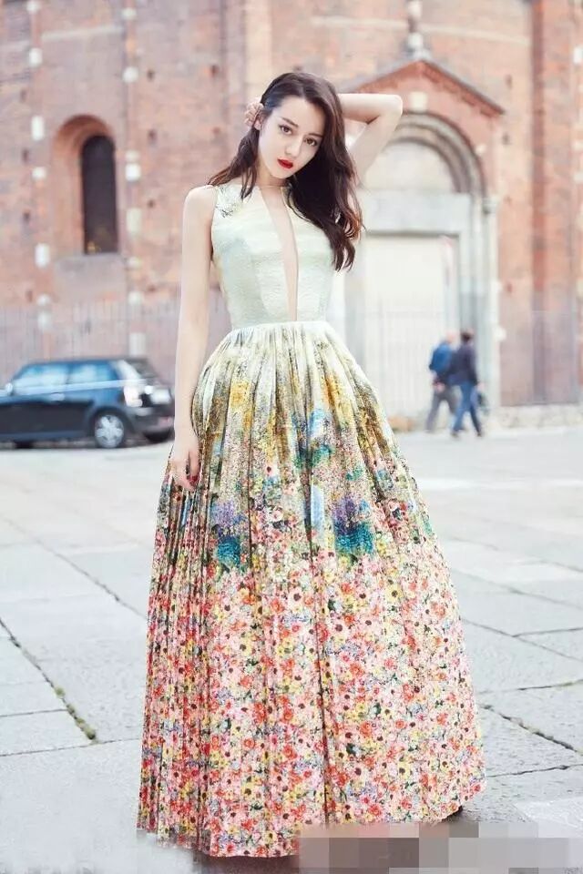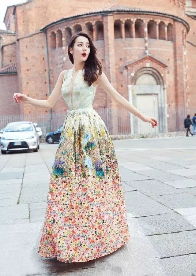 迪麗熱巴身著一襲印花長裙,腳踩黑色高跟鞋,身材十分高挑。長捲髮披肩,優雅迷人。艷麗的紅唇十分魅惑。