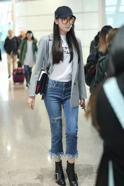 迪麗熱巴的優勢就在於她腿長,即使穿條牛仔微喇褲也挺時髦的,將T恤塞進褲子里面,更顯腿長!一雙黑色短靴,露出纖細腳踝,時髦幹練!
