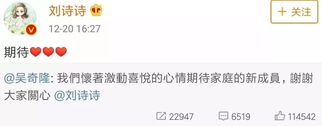 劉詩詩吳奇隆兩人剛宣布迎來了愛的結晶,大家祝福聲一片;
