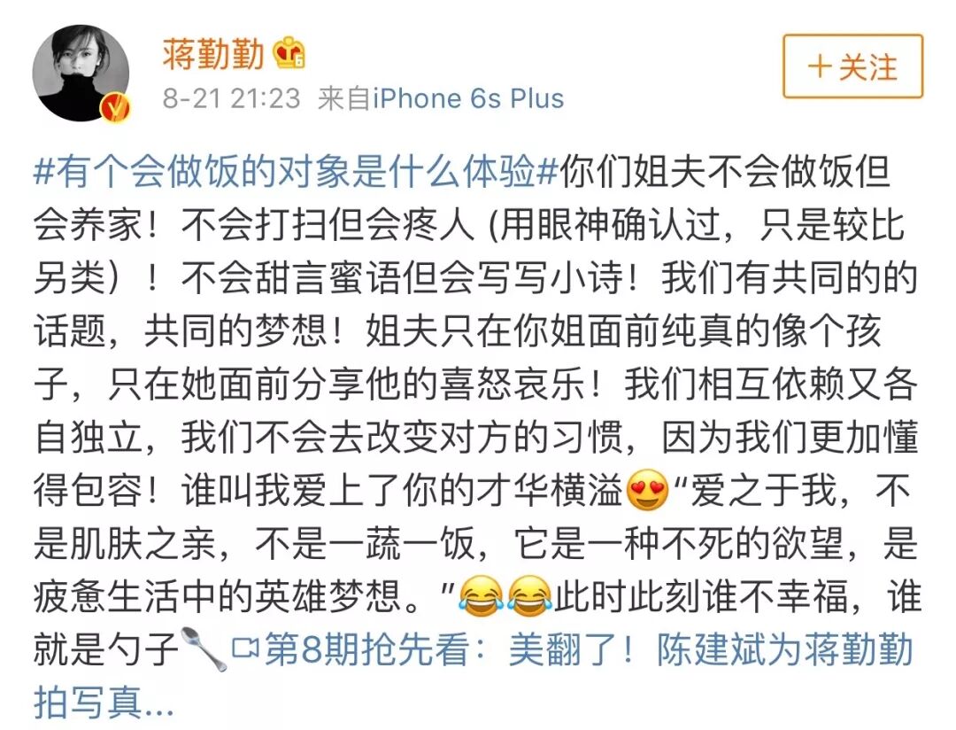 我們看到《幸福三重奏》中陳建斌不愛幹家務活,覺得這樣的直男癌不適合過日子,但人家家里有保姆,本就不需要自己幹家務活呀,連蔣勤勤自己都發了微博稱:「你們姐夫不會做飯但會養家!」