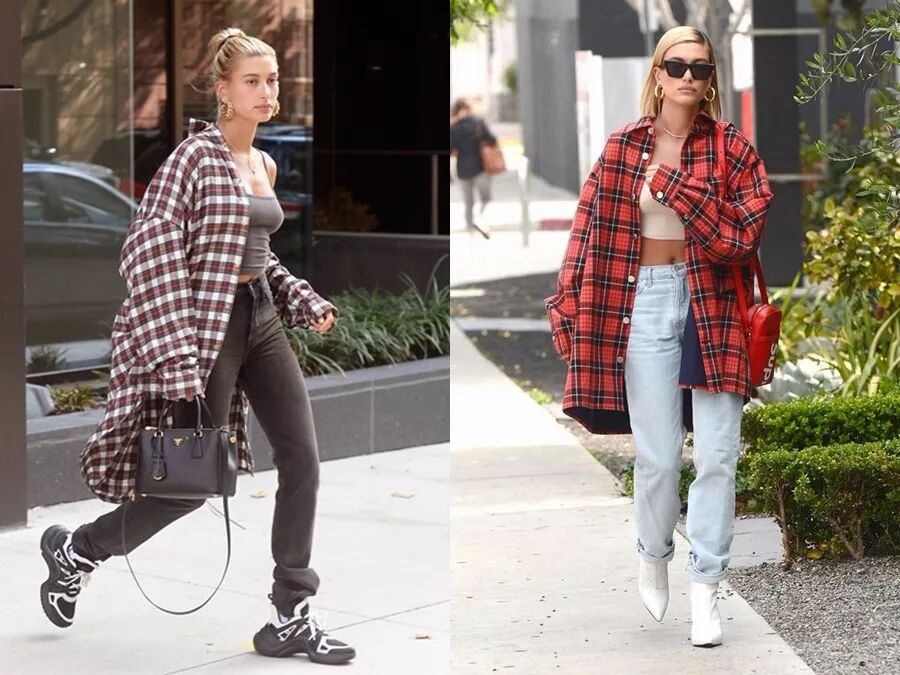 像Hailey Baldwin那樣,將長袖襯衫拿來當初秋的第一件外套,也是街頭酷女孩的標誌。面對Oversize,格紋襯衫也能有春天…
