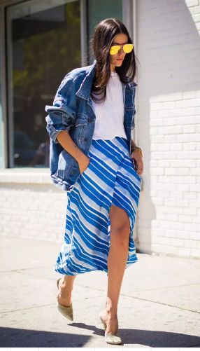 牛仔外套搭配半身裙,里面再搭配一件簡單的純色T恤,慵懶得別有一番味道。