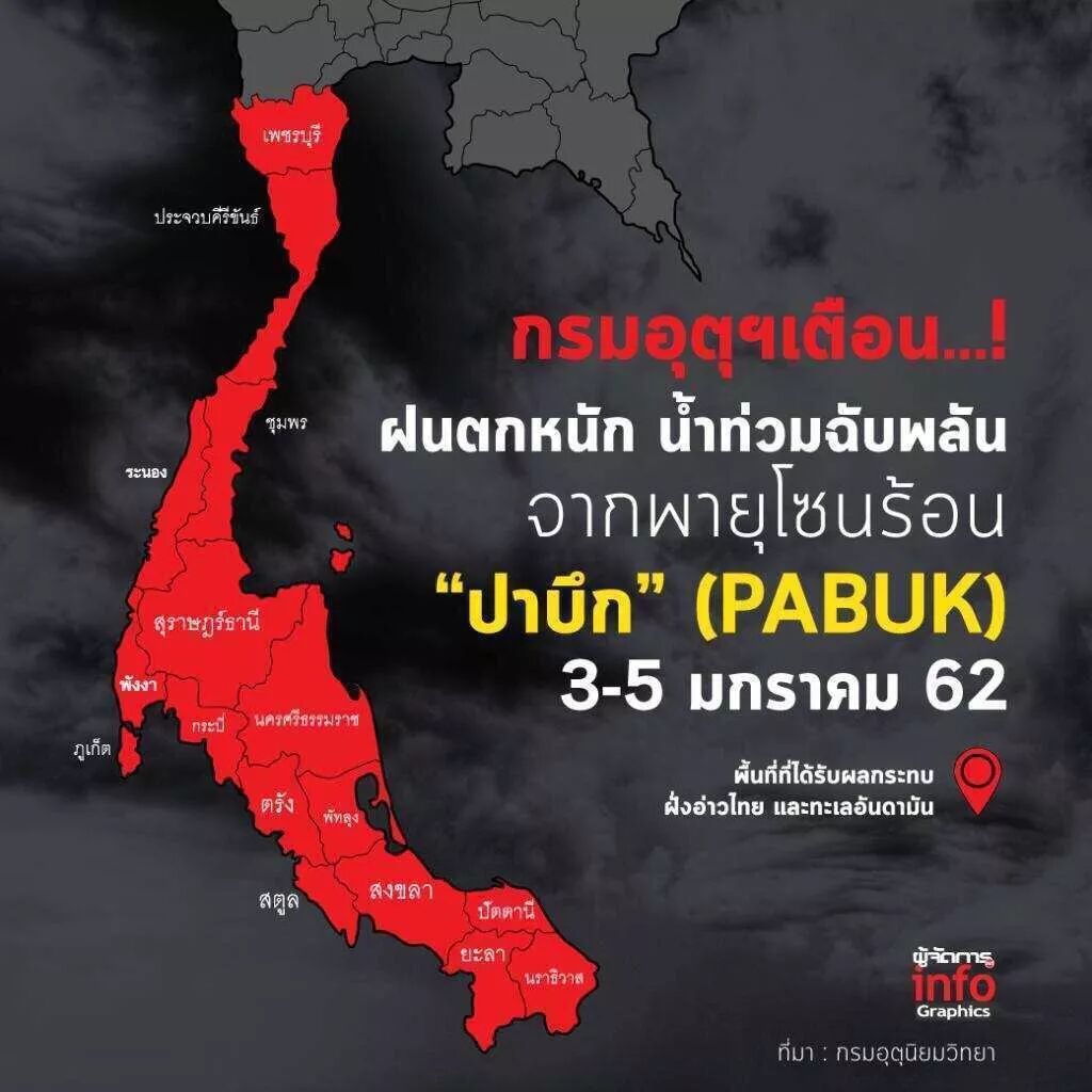泰國國家氣象局局長公開表示,預計台風Pabuk於3日登陸泰國灣,屆時泰國灣、安達曼海海浪高達2-4米甚至更高,並且受台風影響1月3日-5日南方部分地區將有暴雨天氣,請這一地區民眾注意防澇。