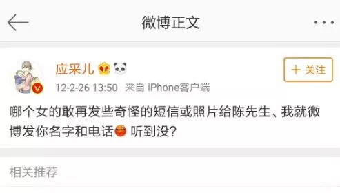 更有網友翻出應采兒曾經發過的一條微博,在2012年時,應采兒就直接在微博上嗆聲小三:「哪個女的再敢發些奇怪的照片和簡訊給陳先生,我就發你名字和電話,聽到沒」,霸氣十足。