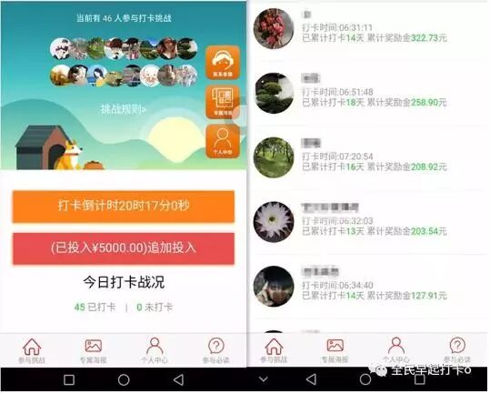 1、參與挑戰需要支付挑戰金,參與早起打卡,放入早起打卡鼓勵金獎池。最低可支付50元,最高可追加到1萬元。當然投入多少,與收益是成正比。