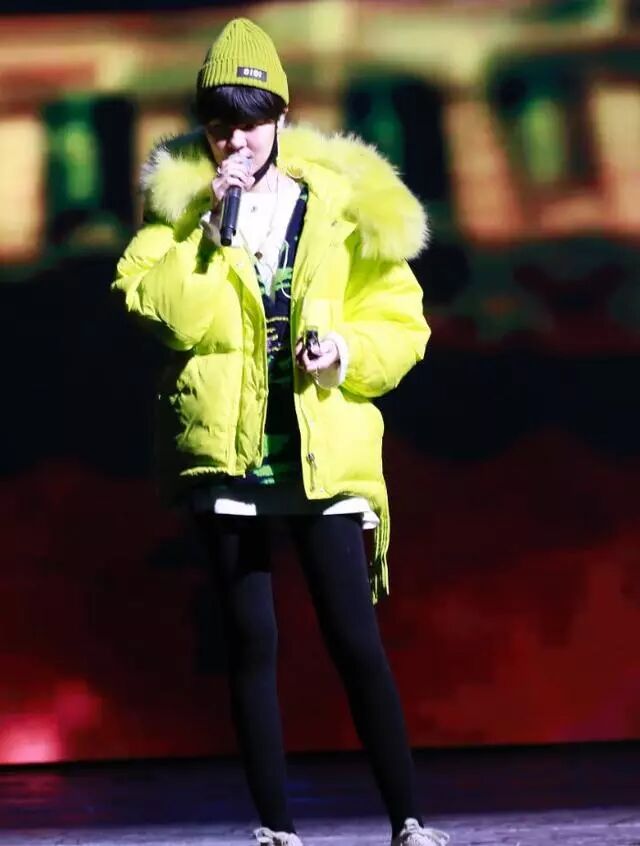 一件綠色的外套,加上這種熒光色,那一個吸睛度極高啊。下身還穿了一條年輕人很喜歡的鉛筆褲,顯腿細。