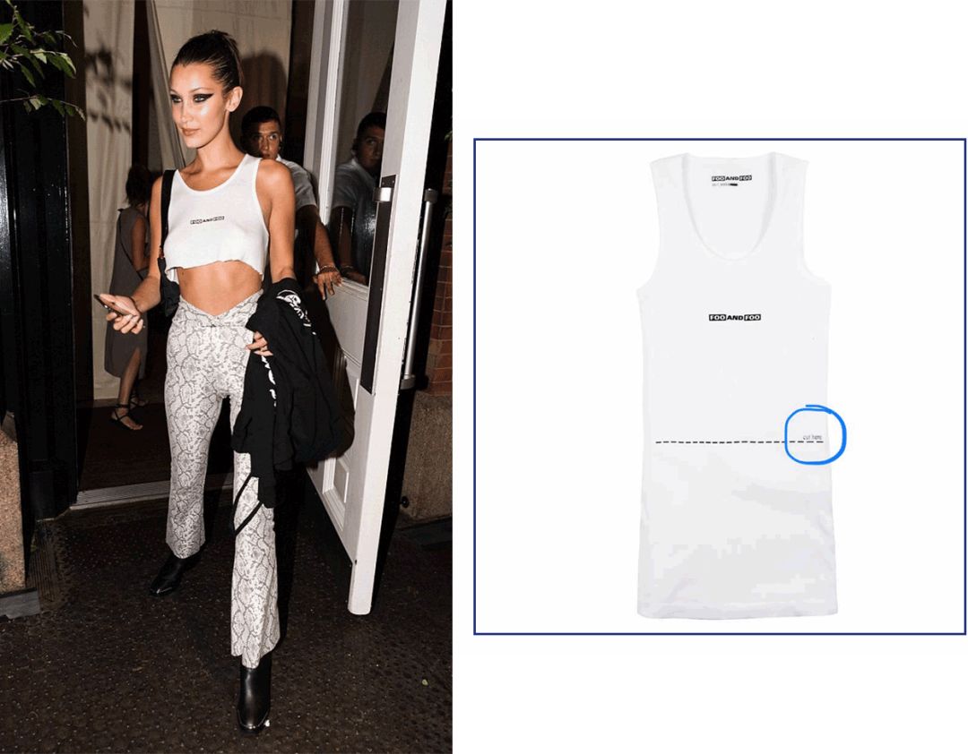 Bella難得親民了一次,身上這件Foo And Foo的t恤才20美元。衣服上有個「cut here」,她就真的自己剪短了。所以你也可以像她一樣手動剪一個滿意的長度。