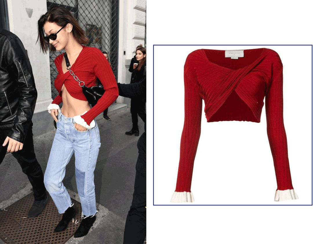 當然也可以穿一些帶有女人味的款,Bella的紅色針織是Esteban Cortazar,胸前扭褶和喇叭袖偏溫柔一點,下身用了率性的牛仔褲來平衡。