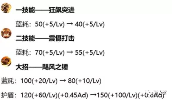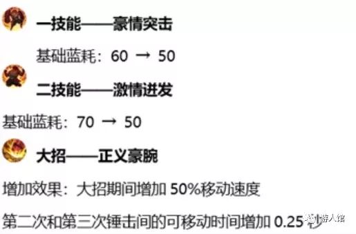 廉頗在加強幾次後還是使用率很低,於是官方這里又加強了一波,藍耗降低不是很關鍵,關鍵是大招增加了移動速度,加上移動時間增加,讓他第3次錘擊命中敵人的概率大增,很可能成為新崛起的坦克。