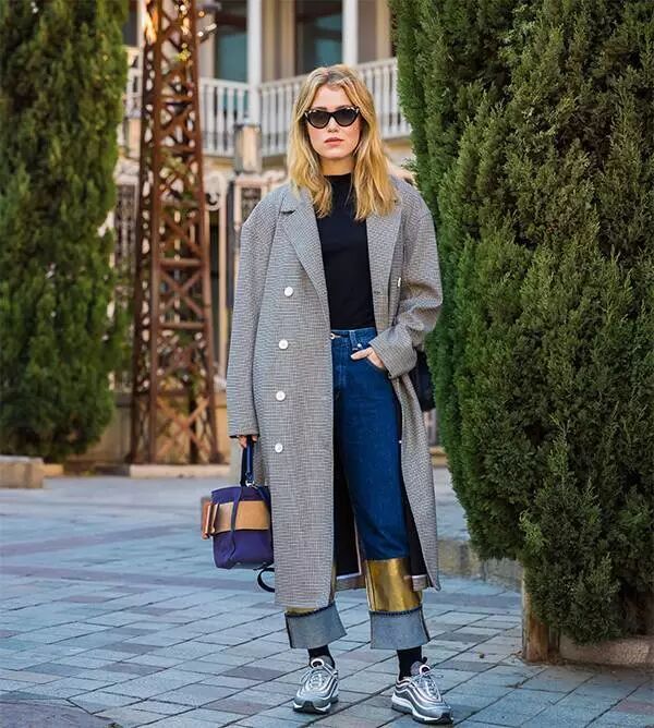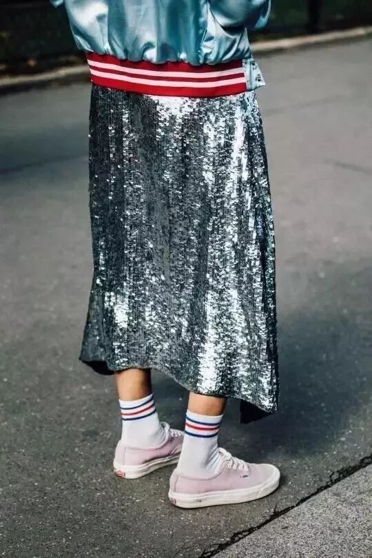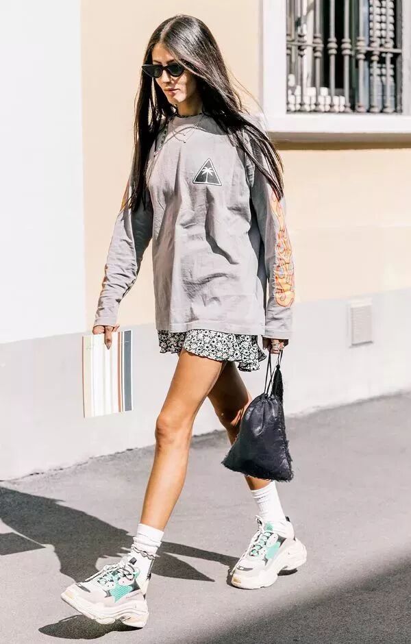 上長下短的搭配更顯腿長,還有一點不經意間的小性感,如果覺得腿上太空,搭配一雙白襪子,能減少運動鞋的厚重之感,更加有活力。