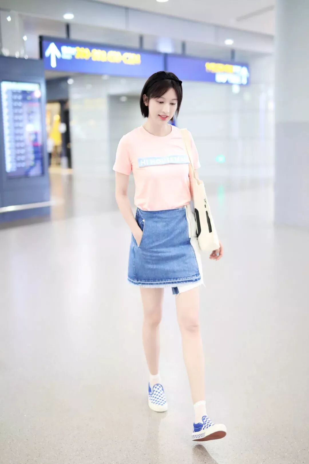 張儷粉色 T 恤搭配牛仔褲簡單舒適,再加上一雙清爽的小白襪,顯得乖巧許多。