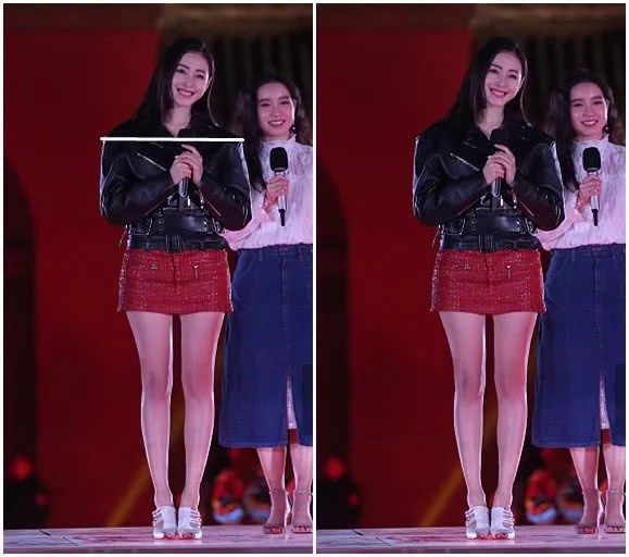 她上面穿了一件黑色的皮衣,下面卻配了一條紅色的超短裙,下身搭裙子又是H型,看著實在是別扭,真想幫她把腿給並攏起來。