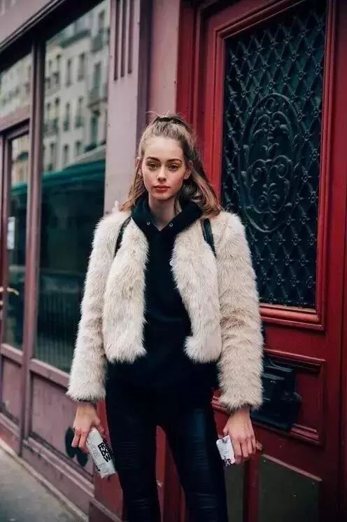 還有「人造皮草」,搭配黑色連帽衛衣,倒把皮草顯得非常日常適合出街了呢~