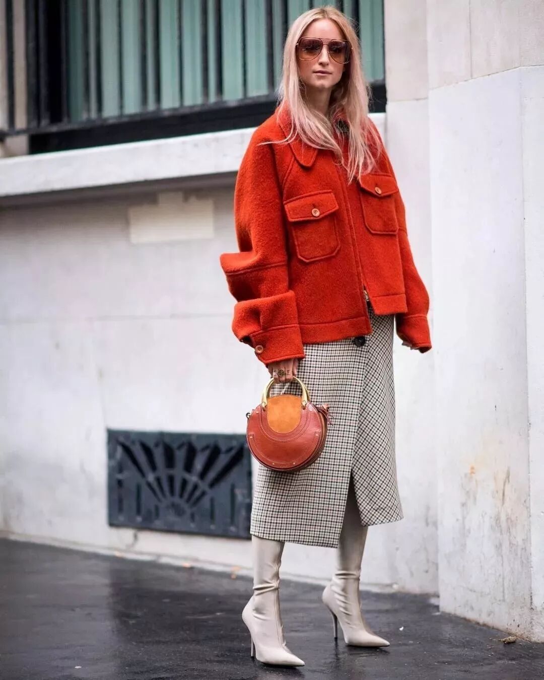 成熟的柿子色毛呢短外套非常符合年輕女生,保暖時髦,是一種可愛少女風,同色的圓形包巧妙相呼應,更有細節感
