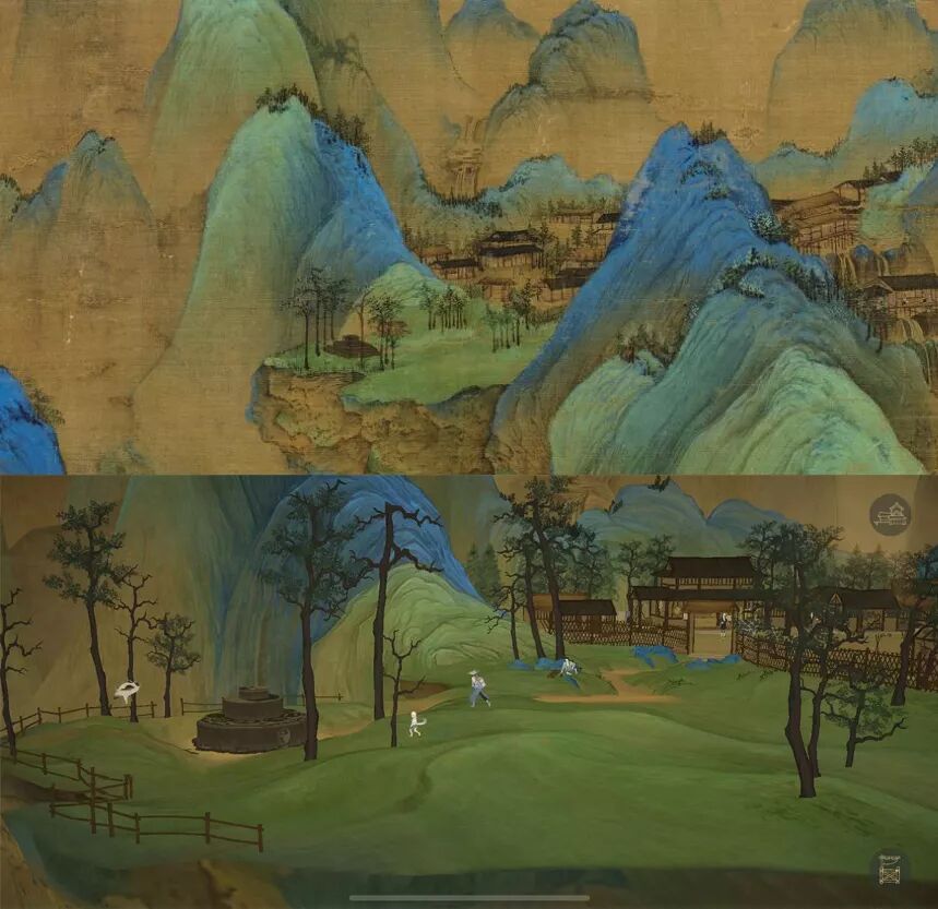 《千里江山圖》局部和《繪真·妙筆千山》遊戲場景對比