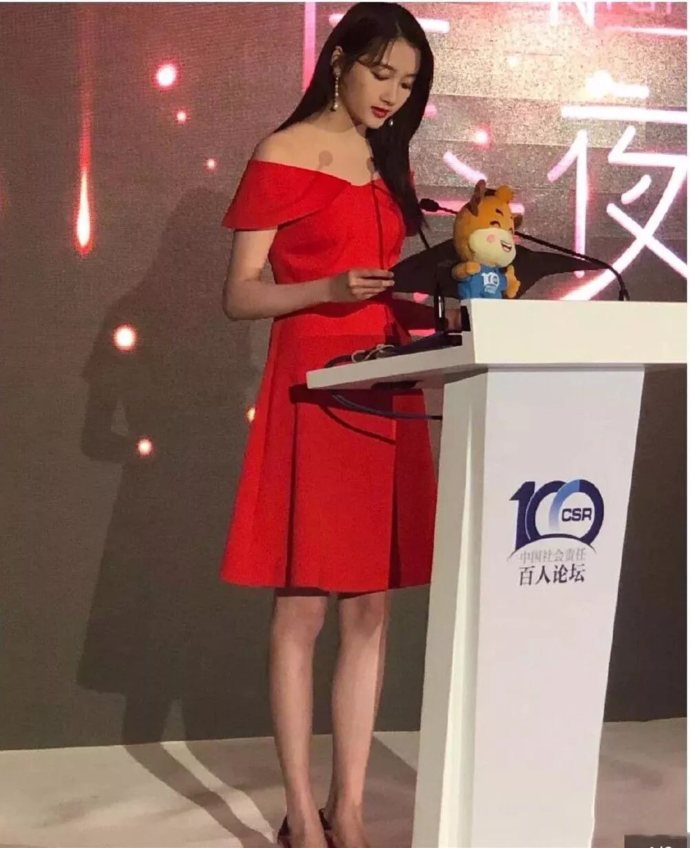 關曉彤穿上這件紅色的一字肩的裙子看起來非常的優雅了,但是這條裙子腰部設計非常的寬鬆看起來關曉彤腰還是沒有