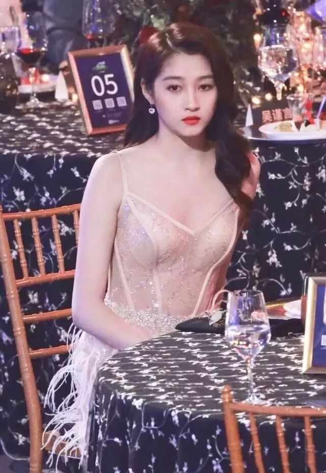 看看關曉彤穿了一件裸色的吊帶長裙非常的性感了,這條裙子算是比較的修身的而且有點透視的感覺看起來很成熟了