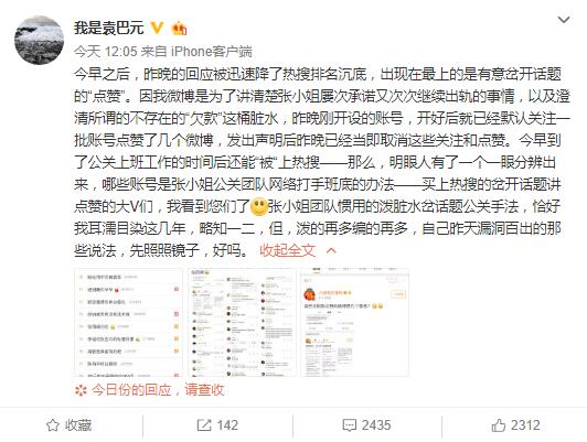 感覺袁巴元也是時刻在關注自己的動態,於是馬上出來給了大家一個說法,點讚是微博自動的,上熱搜是被張小姐工作室的人暗箱操作的,還指出張雨綺昨晚的聲明漏洞百出啊。