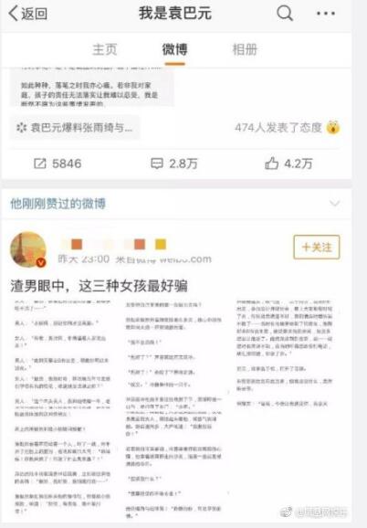 而今早上,袁巴元點讚的微博成了榜首最熱,原來網友發現袁巴元在新開的微博上,點讚了一條——《渣男最好騙的三種女孩》的微博,大家一臉懵嗶,這是什麼迷之操作?