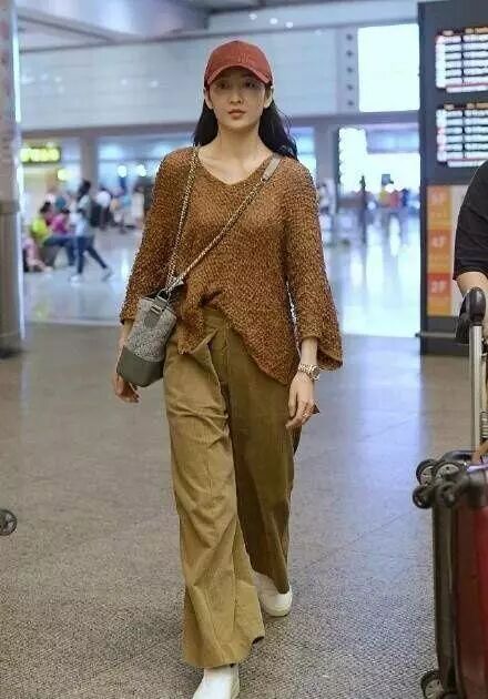 土黃色的褲子看起來非常的有個性了而且還是闊腿的看不出腿粗還是細,棕色的毛衣特別的性感是深v的那種,很符合她的氣質了