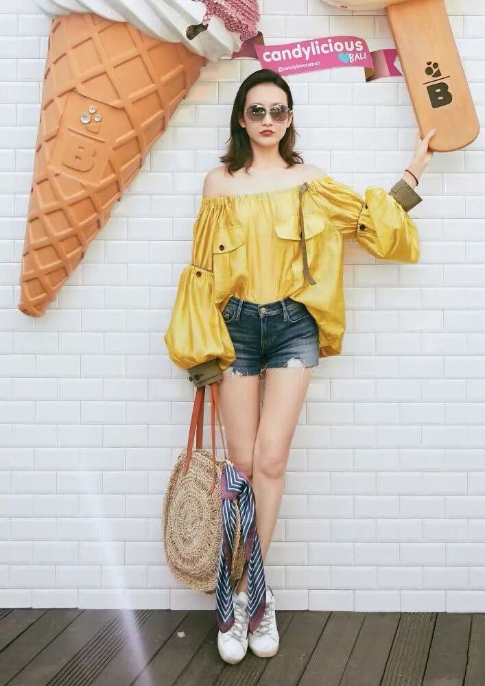 黃色的一字肩非常的性感了而且顯得她的皮膚特別的白,搭配的藍色的超短褲,看起來腿非常的好看顯得也很長啊。