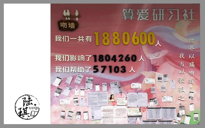 在算愛研習社里,有一堵牆,我們叫「吻牆」。上面有一句話:當世界以痛吻我,我定當以歌報之。