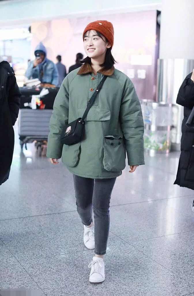 沈月上半身穿了一件綠色的棉服,比較臃腫。下半身搭配一條黑色的牛仔褲,小短腿太不好看了,還穿了一雙平底鞋,分分鐘變成小矮人。