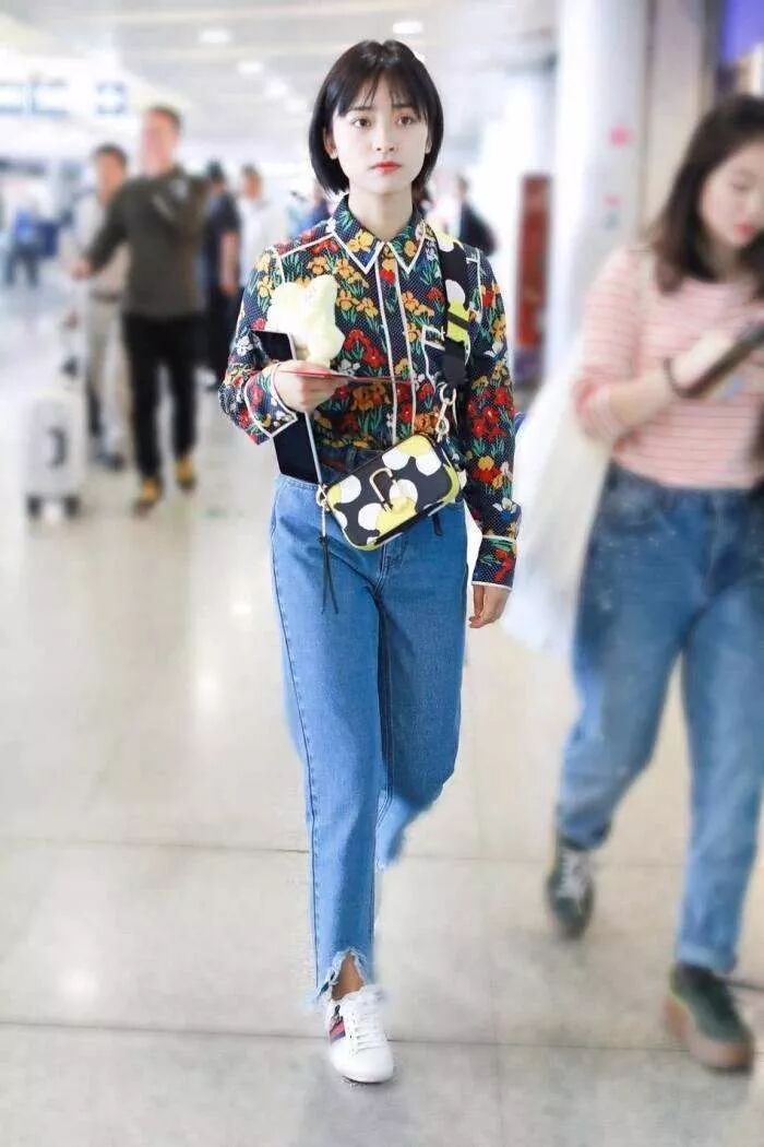 沈月上半身穿了一件非常有特色的襯衫,上面印著非常豐富多彩的各種花朵。下半身倒是非常簡單,是一件藍色的牛仔長褲。