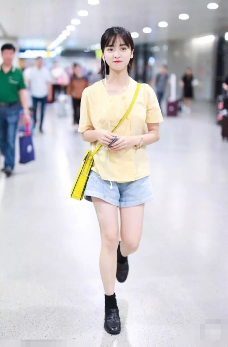 沈月的這一套衣服非常青春有活力,上半身穿了一件檸檬黃色的短袖,下半身搭配一條藍色的牛仔超短褲。這一套都非常清涼。