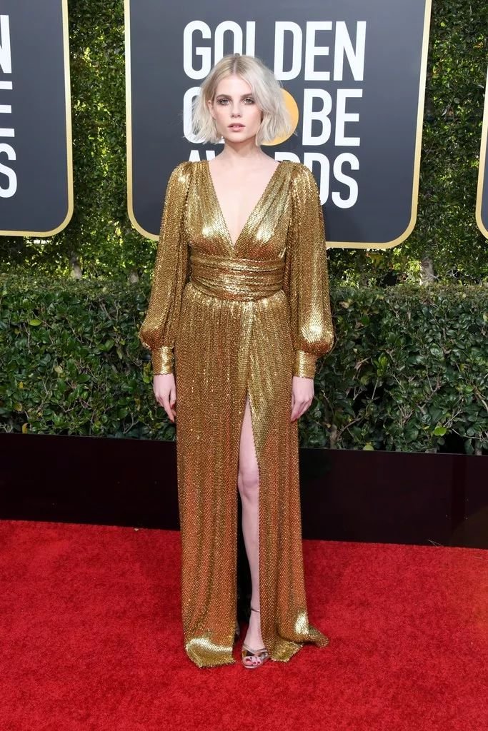 露西·寶通的紅毯照拍得跟硬照一樣,這個顏簡直是無死角,就是這件金色禮服顯得她沒有腰。