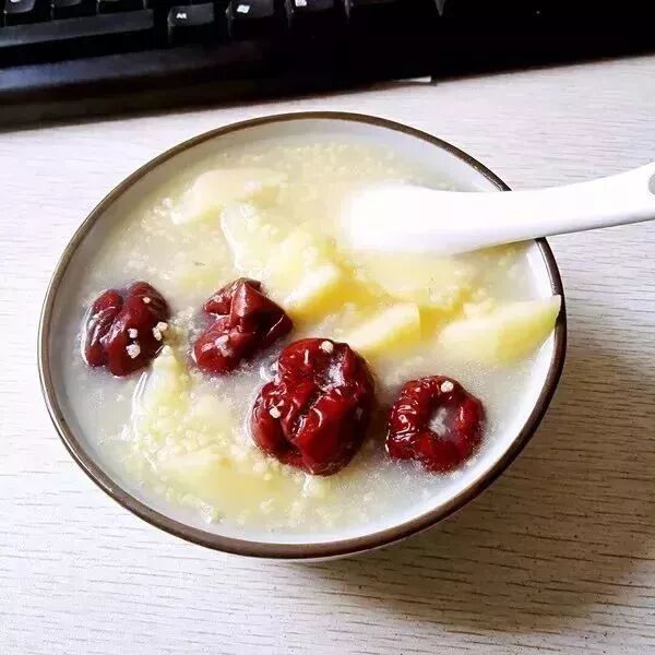 2、把粳米、紅棗、山楂和蘋果塊一同放入鍋中,加水熬成粥就可以吃啦,不用放糖,清甜還健康!