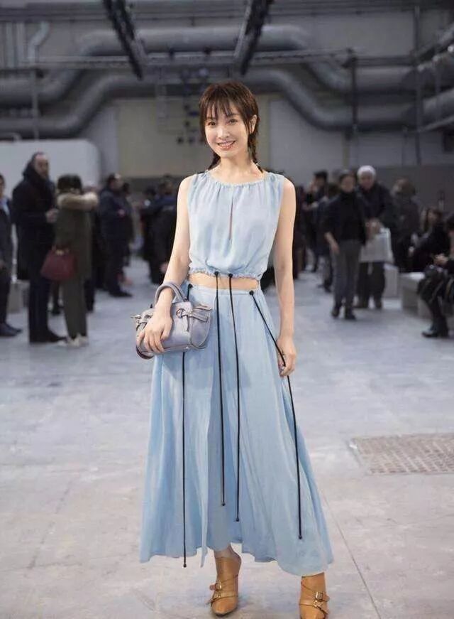 吳昕穿的這一整套衣服,非常的精致。這種藍色是淡淡的天藍色這一套裙子是上下分開來的,上半身是無袖的設計。
