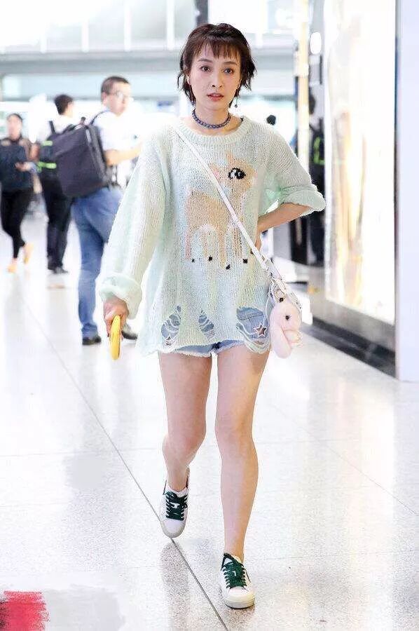 吳昕穿著的這一件,薄荷綠的針織衫,看著非常的可愛,很有童趣,上面還印著一只梅花小鹿的造型。再配上無心的嬌俏短髮,更加可愛了。