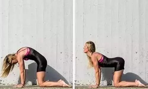 2.吸氣,同時慢慢地將盆骨翹高,腰向下微曲,形成一條弧線。眼望前方,垂下肩膊,保持頸椎與脊椎連成一直線,不要過分把頭抬高。