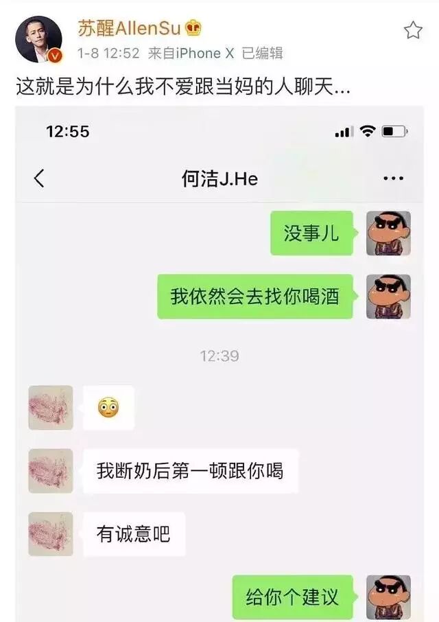 雖然之前的聊天刪了,蘇醒也對把何潔送上熱搜似乎很內疚,於是再度曝光和何潔的最新聊天記錄,而且還說:你們所見過的豬隊友,跟我比都是優秀的!不過從他再度曝光和何潔的最新聊天記錄來說,何潔應該生氣:是不是也可以確定何潔真的生了三胎?一開始有人覺得蘇醒這樣公開和朋友的聊天記錄是對朋友的不尊重,但是現在看網友應該是想多了:因為何潔都沒生氣。