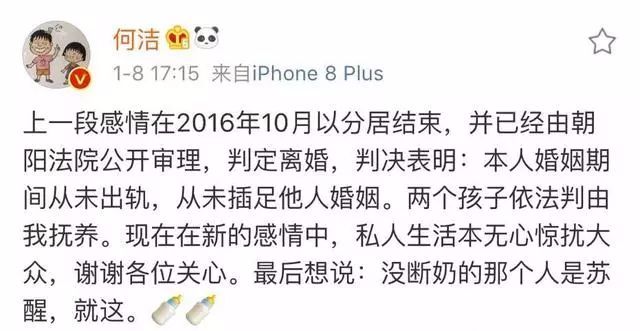 很快何潔發微博表示自己的上一段感情在2016年10月以分居結束,法院判決自己婚姻期間從未出軌,也未插足他人婚姻。現在在新的感情中,謝謝大家關心。