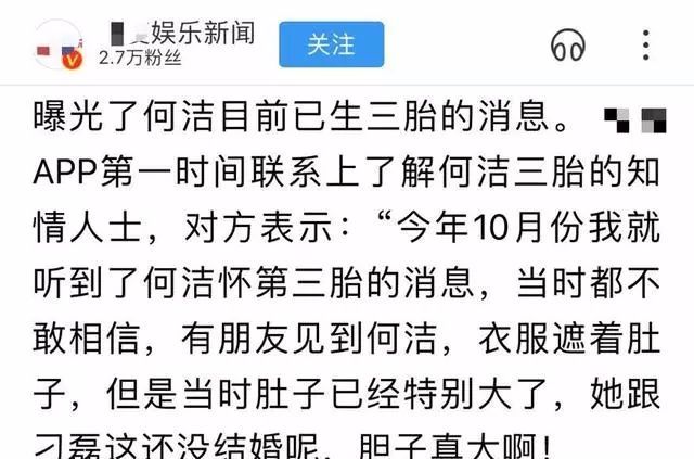 有媒體聯繫到知情人士,對於何潔生三胎對方表示確有此事:「今年10月份我就聽到了何潔懷第三胎的消息,當時都不敢相信。之後朋友見到何潔,衣服遮著肚子,但是當時肚子已經特別大了,她跟刁磊還沒結婚呢,膽子真大啊!」