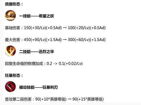 本次體驗服改動的重頭戲,呂布2技能CD改為固定8秒,3技能CD改為固定50秒,1技能基礎傷害增加AD加成減少,大招的基礎傷害增加AD加成減少。也就是說改動後呂布前中期的傷害會得到提升前期清線能力提高了不少,加上2技能CD變成固定8秒,抗壓能力也有了;至於後期,如果走的是半肉流影響不大,如果你走的是攻速暴擊流(出了破軍+無盡戰刃之後)傷害會略微降低。