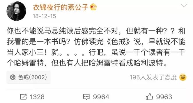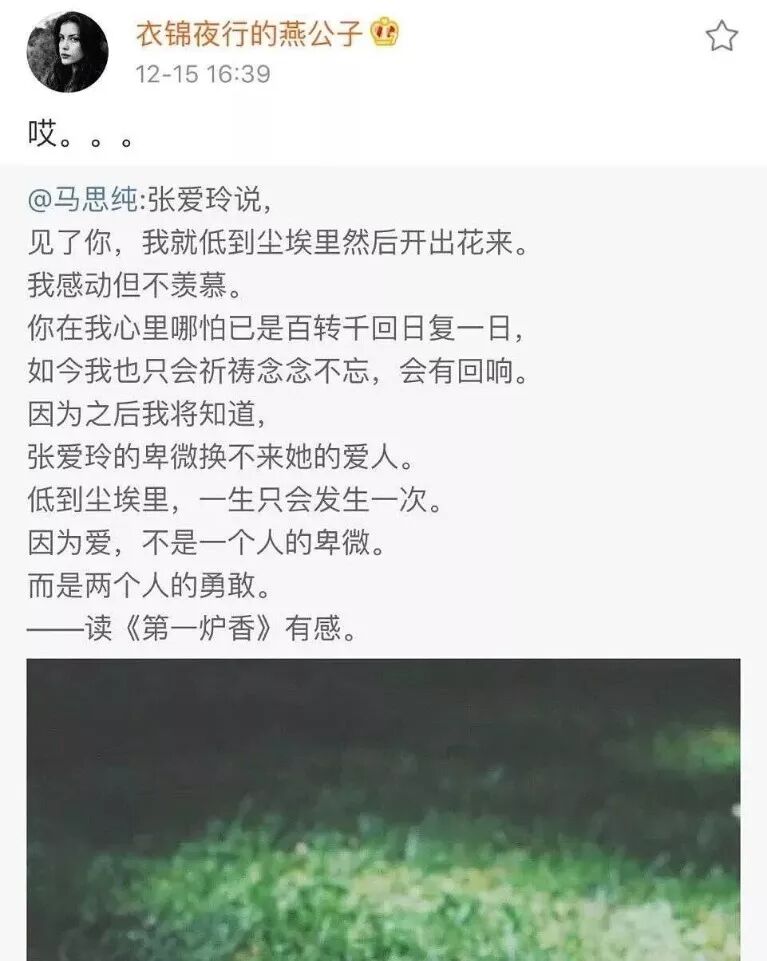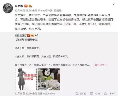 本來只是燕公子和馬思純之間的撕逼,但因為涉及到張愛玲,所以也引起了張迷們的注意,直接指出馬思純曾寫過的張愛玲語錄都是錯的。