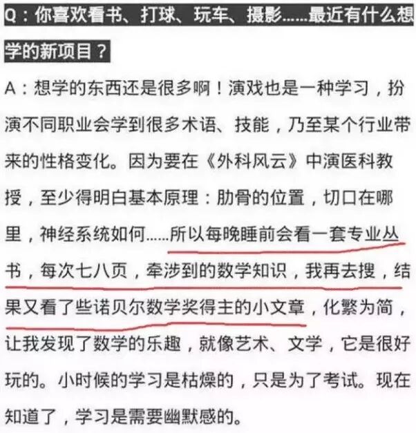 被採訪時說每晚睡前會看一些專業書,再看看諾貝爾數學獎得主的小文章。