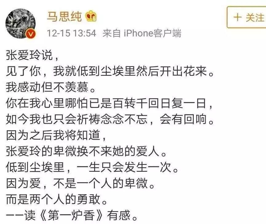 起因是馬思純委婉官宣自己是《第一爐香》的女主,但她話不好好說,卻分享了一則關於張愛玲《第一爐香》的觀後感。