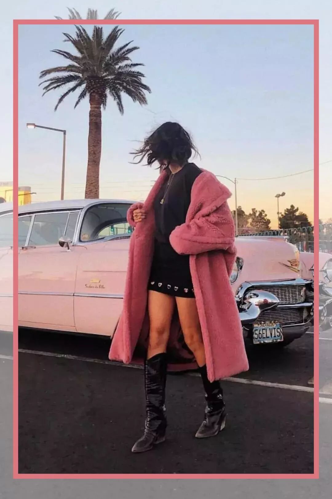 簡單的純色毛衣塞進短裙里,搭配毛茸茸的外套和長靴,滿滿的粉紅浪漫氣息。