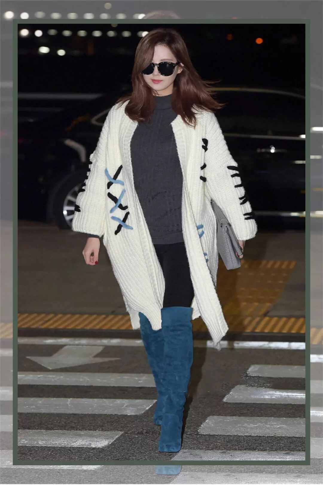 秀智的同色系穿搭,白色的長毛衣搭配黑色皮面過膝鞋,精致的妝容氣場十足。泰妍的綠色長毛衣+泰迪外套,搭配黑色過膝靴,露出完美的身材比例。