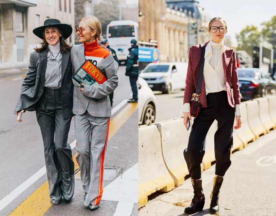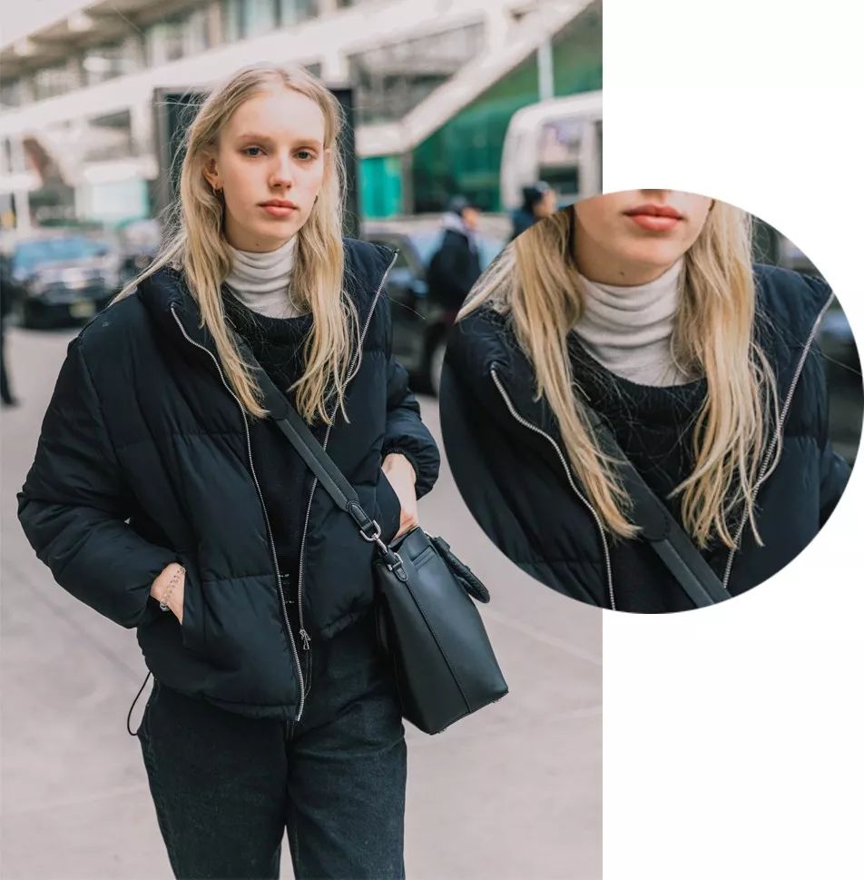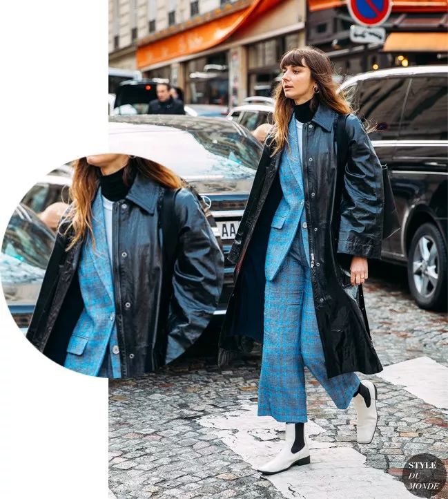 格紋西裝+拉鏈高領衫,不會太嚴肅也不會太隨意。那種微透的高領衫也不要急著收起來,搭配羽絨服分分鐘性感又時髦▼