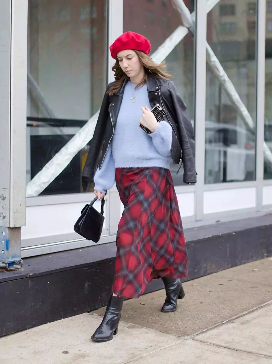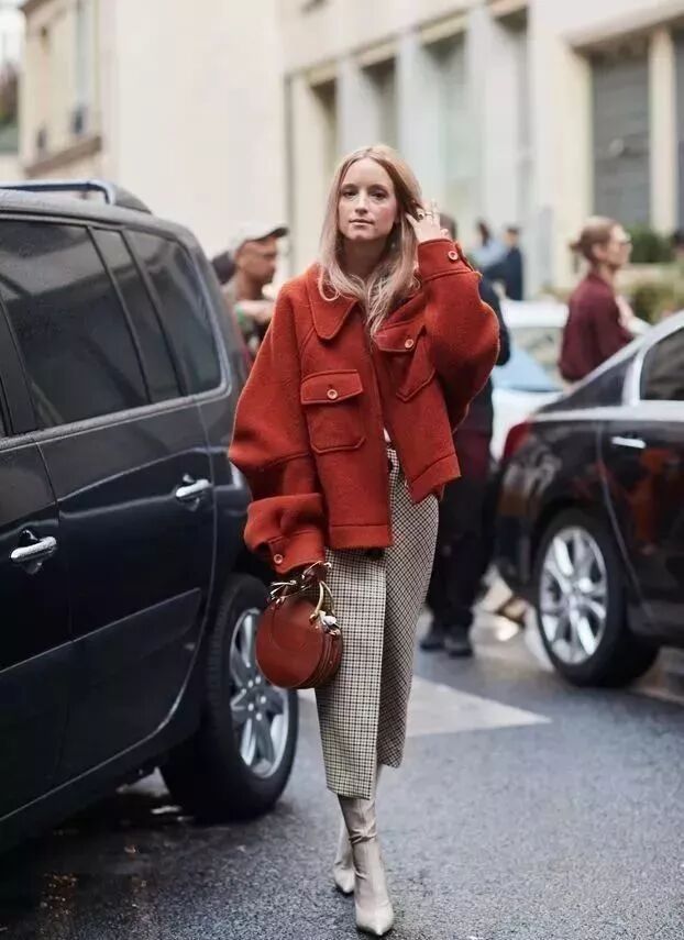 今年磚紅色的外套特別流行,搭配格子裙,特別白嫩簡直就是溫柔本人了。