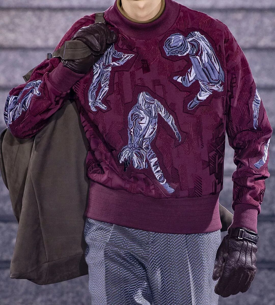 富有動感的圖案組合演繹出多元融合的理念,提花設計貫穿本季所有服飾,羊絨、皮革和紙張感的紋理交織相融;醒目的標語和都市景象演變為大膽、抽象的印花和提花圖案。