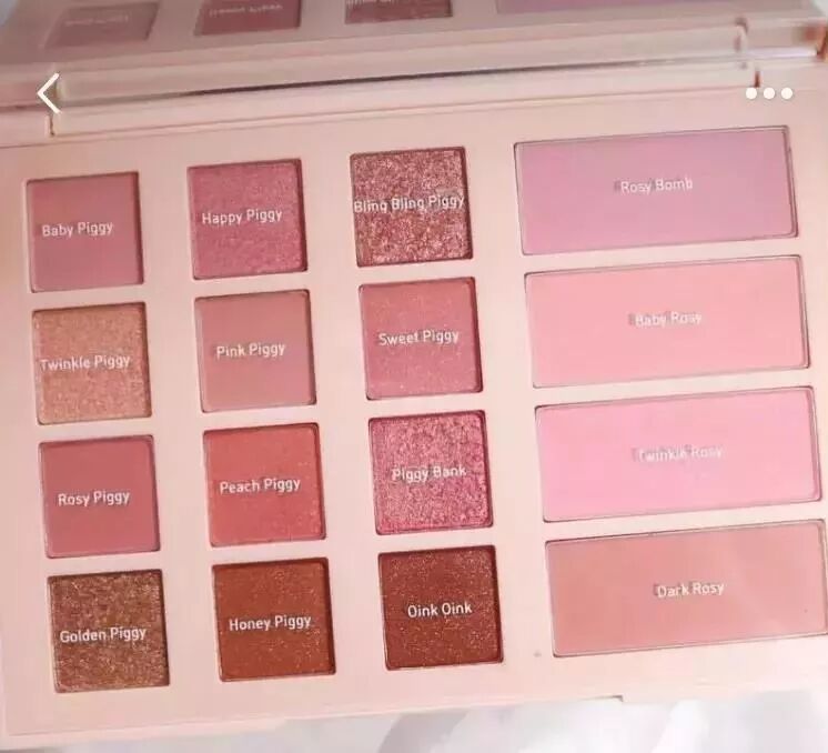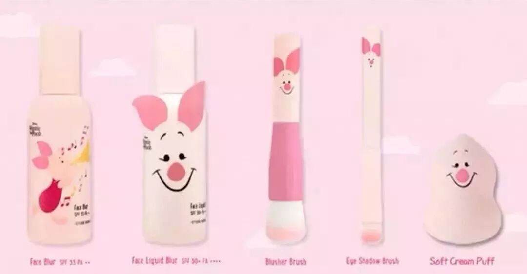 這次的設計主要以小豬皮傑為創作點,推出了5支唇釉,5個腮紅,10個單色眼影,2個妝前乳,2把化妝刷,還有一個巨軟萌的海綿蛋,簡直齊全。